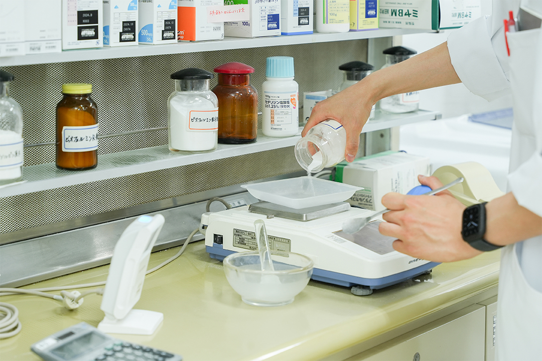医療機関から発行された処方箋に基づき保険調剤を行います。服用薬が多数あるまたは、複数の医療機関にかかっていてお薬の管理が困難な患者さんには服用時点毎にお薬をまとめる一包化などの対応を行なっております。また服用しやすい薬剤への変更提案なども行っており患者さんの服用意識の向上にも努めています。お薬調剤後も必要に応じて患者さんへのフォローアップを行っております。各種クレジットでの支払いに対応しております。処方せんはFAXやスマホアプリでも受付可能です。